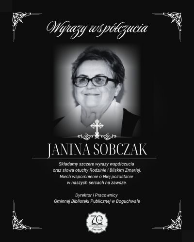 Z głębokim smutkiem przyjęliśmy wiadomość o śmierci Śp. Janiny Sobczak wieloletniej dyrektorki Gminnej Biblioteki Publicznej w Boguchwale, osoby niezwykle zasłużonej dla rozwoju bibliotekarstwa oraz kultury w naszej gminie. Pani Janina Sobczak s ... [ więcej ]