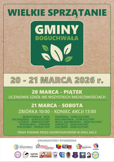 Zapraszamy mieszkańców do udziału w akcji Wielkiego Sprzątania Gminy Boguchwała, która odbędzie się 20–21 marca 2026 r.. Razem zadbajmy o nasze otoczenie i pokażmy, że los naszej gminy nie jest nam obojętny!