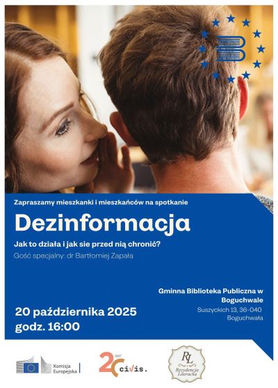 Gminna Biblioteka Publiczna w Boguchwale zaprasza na spotkanie poświęcone zagadnieniu dezinformacji – ukrytego zagrożenia, z którym każdy z nas może się zetknąć. Podczas wydarzenia dowiemy się, jak działa dezinformacja, dlaczego stanowi tak poważne niebezpieczeństwo oraz jakie metody pozwalają skutecznie się przed nią bronić.