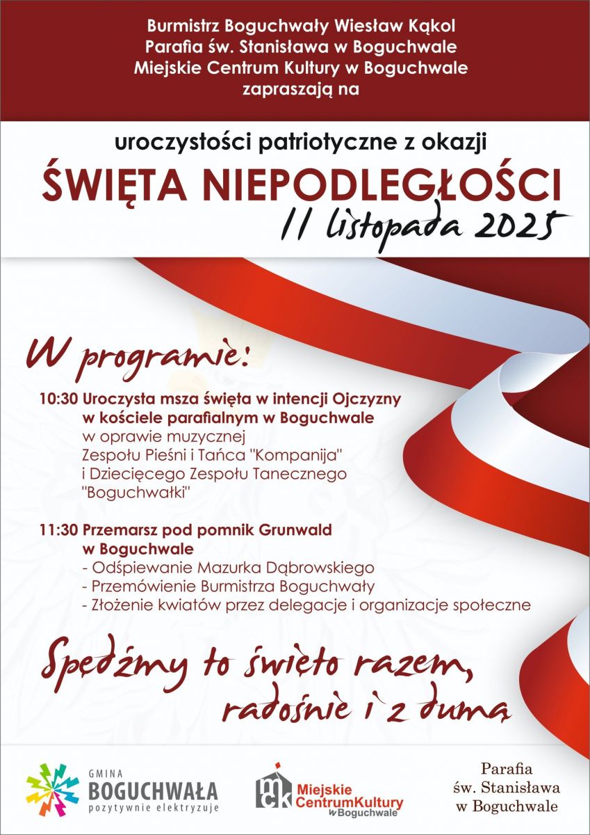 Miejskie Centrum Kultury w Boguchwale zapraszają na uroczystości patriotyczne z okazji Święta Niepodległości 11 listopada 2025 r.