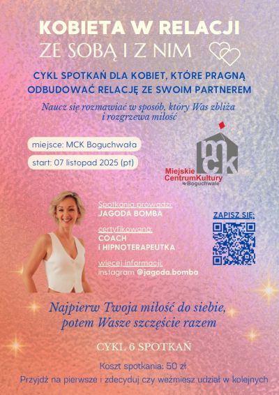 To właśnie dla Ciebie powstała "Kobieta w relacji - ze Sobą i z Nim" – 3-miesięczny cykl spotkań, w którym nauczysz się zmieniać swoje przekonania, odzyskasz wiarę w siebie i zaczniesz