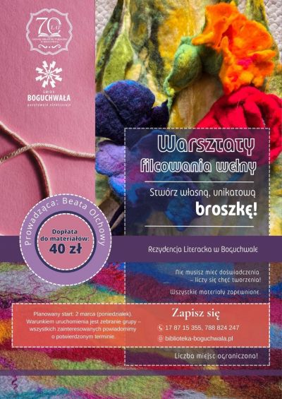 STWÓRZ COŚ WYJĄTKOWEGO! Warsztaty filcowania wełny w Bibliotece w Boguchwale Masz ochotę na chwilę relaksu z rękodziełem? Chcesz wyczarować własną, unikatową biżuterię, której nie znajdziesz w żadnym sklepie? Gminna Biblioteka Publiczna w ... [ więcej ]
