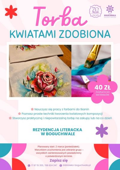 STWÓRZ TORBĘ SWOICH MARZEŃ! Warsztaty malowania na tkaninie Masz dosyć nudnych, powtarzalnych toreb? Czas to zmienić! Gminna Biblioteka Publiczna w Boguchwale zaprasza na wyjątkowe warsztaty, podczas których zwykła bawełniana torba z ... [ więcej ]