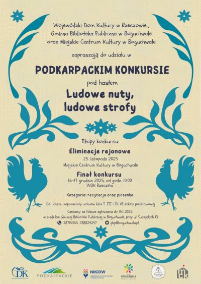 Gminna Biblioteka Publiczna w Boguchwale zaprasza uczniów klas I–III oraz IV–VI szkół podstawowych do udziału w kolejnej edycji Podkarpackiego Konkursu „Literatura i Dzieci”, organizowanego przez Wojewódzki Dom Kultury w Rzeszowie. Tegoroczne hasło brzmi: „Ludowe nuty, ludowe strofy”.