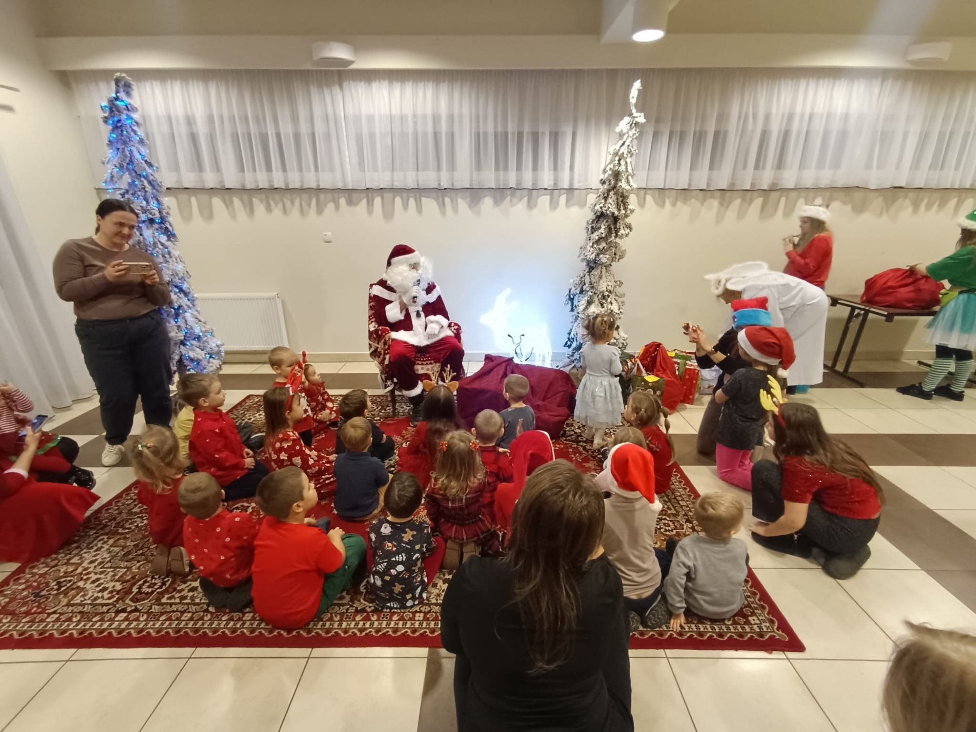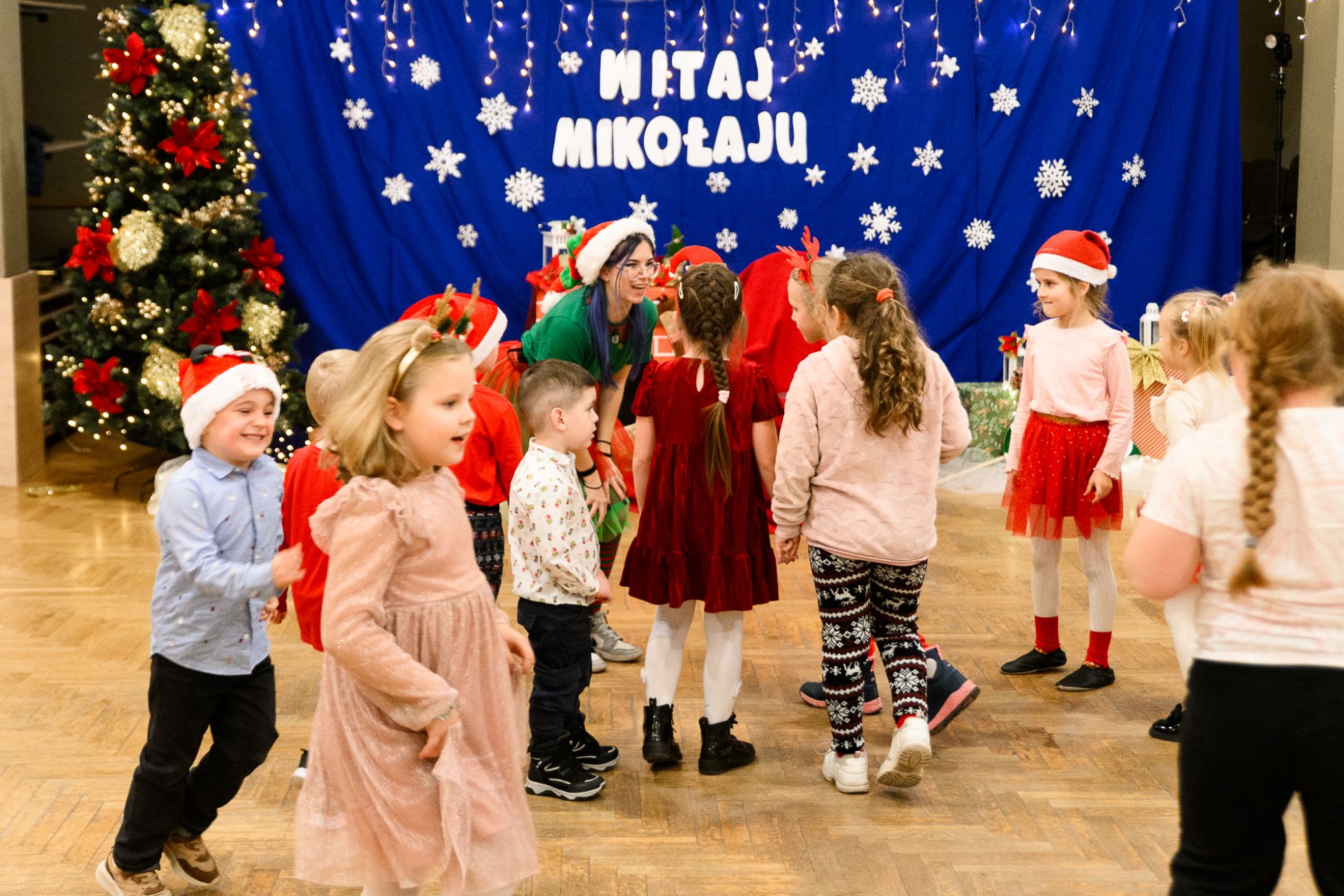 Dzieci miały okazję spotkać się ze Świętym Mikołajem, a także bawić się podczas zabaw i animacji prowadzonych przez animatorkę z Przebieranka - Prowadzenie Imprez. Było dużo śmiechu, energii i wspaniałej świątecznej atmosfery!